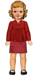 What’s on the menu? This children's sewing pattern for a girl’s double-breasted unlined jacket has band collar, gathered empire waist, and cuffed long sleeves. Optional bias trim to finish facing edge and seam allowances. The A-line skirt child's sewing pattern features front pockets and back kick pleat with elasticized back waistband.
