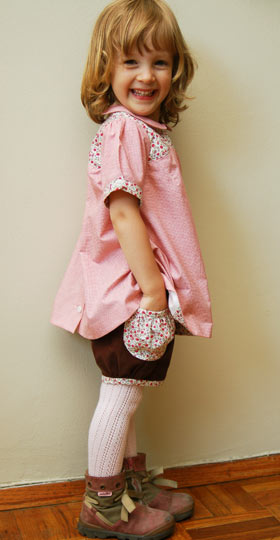 Here is the Puppet Show short made up in fine-wale corduroy with printed cotton trim to match the tunic. Worn with tights and boots or Mary Jane shoes, it’s a great autumn outfit—particularly with a soft cardigan worn on top.