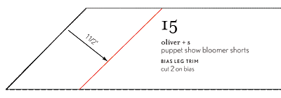 - The first printed version of this pattern contained an error on pattern piece 15. You should trim 1 1/2" from one end of piece #15, the Bias Leg Trim, maintaining the same angle as the original piece. This adjustment should be made for all sizes as in the illustration shown below. This error has been corrected in the second printing of the pattern and in the digital version that is being sold now on our website.