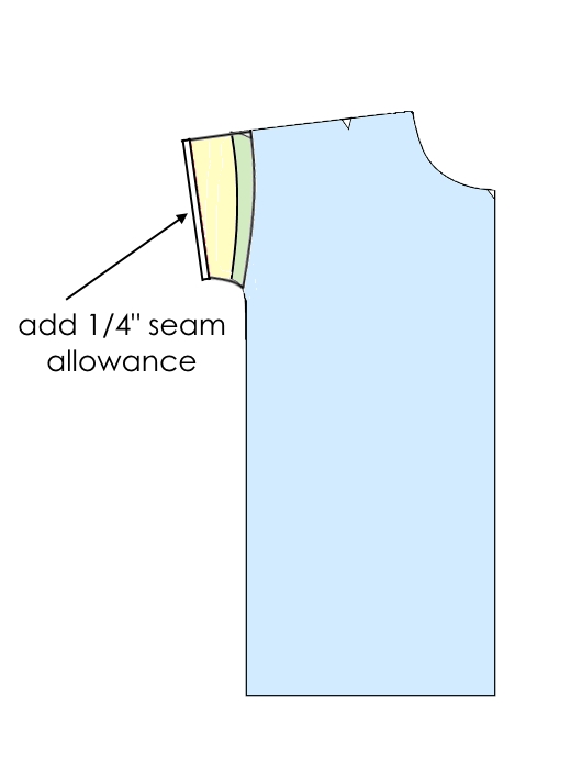 Finally, you needed to add 1/4” seam allowance to the sleeve pattern piece at its new horizontal shoulder seam.