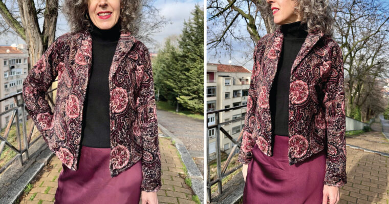 I considered interfacing this fabric to give it a little more body, but the softness and slouchiness of the finished jacket makes it very cozy and easy to wear. It’s a very different look and feeling from the wool and neoprene version, that’s for sure! I’m wearing it mostly with jeans, but the colors coordinate with all the camel colors in my wardrobe, and I also love it with this burgundy silk bias-cut Garibaldi skirt. Plus, with the black background, this jacket coordinates with almost everything I own.