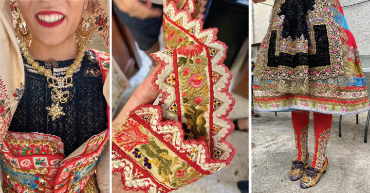 Here are a few of my favorite shots from the day, and if you look closely at the ribbon in the photo at the bottom right you can see the back of the ribbon–just to prove that it’s all hand embroidered. Also, look at the jewelry! Very Moroccan and maybe even Indian in its inspiration. It’s fascinating to me to see how each region can have such a specific regional costume, and yet so many of the influences of those costumes can come from so far away.