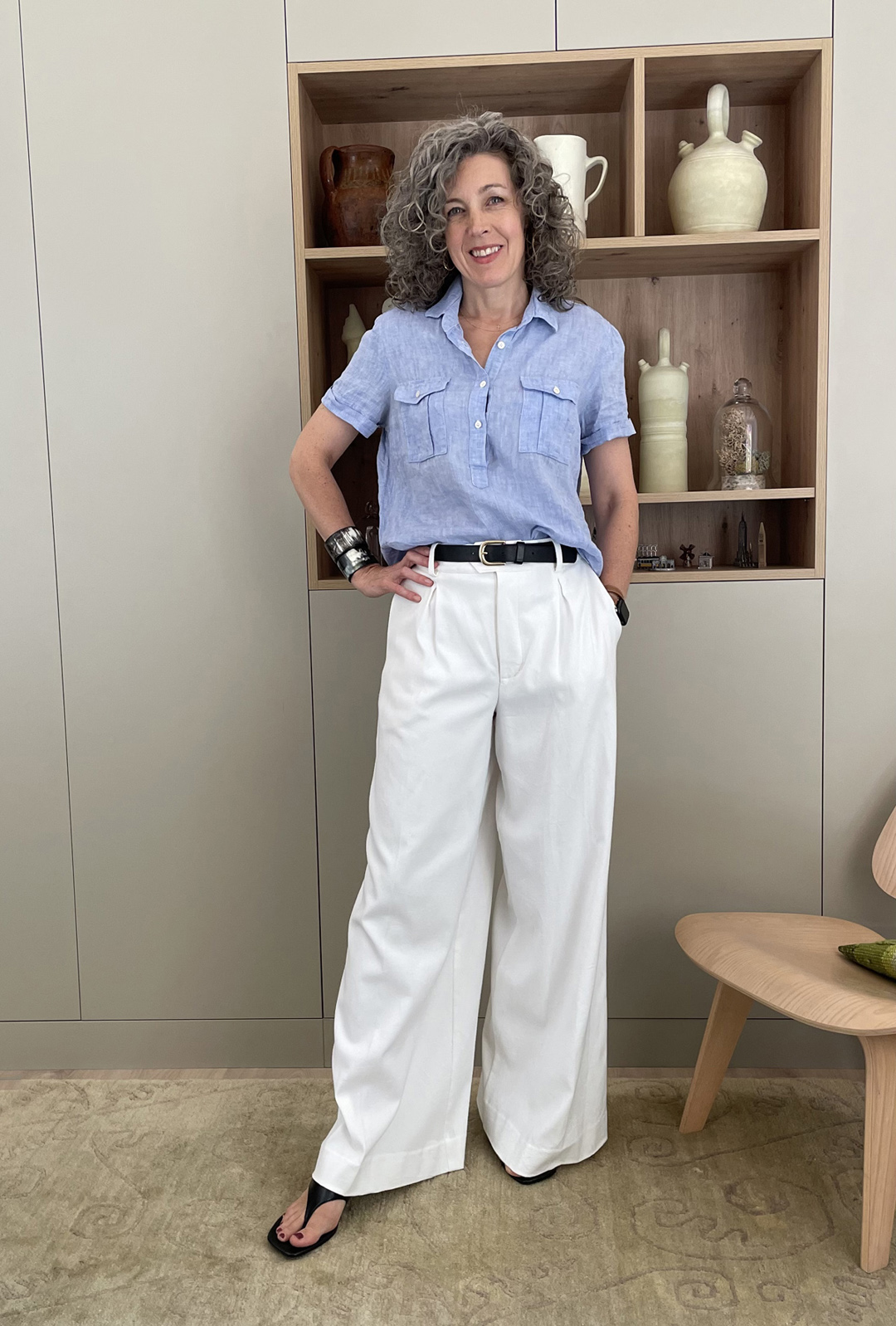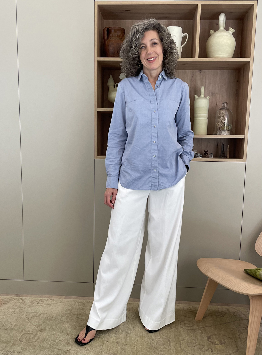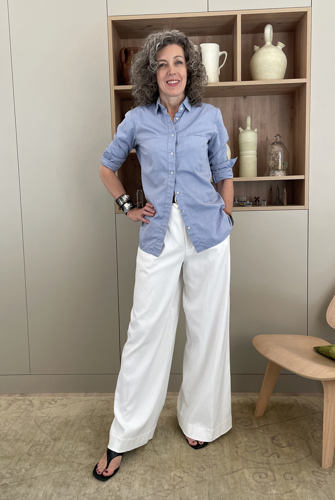 4. Show a little skin someplace. Roll up and push up your sleeves, unbutton the neckline a bit, and wear a shoe that allows a little skin so you’re not covered from head to toe. The key is to give some relief to all that fabric! (Also, do you see how, by leaving the bottom buttons of the shirt open and cinching the waist a bit at the back, I’ve also given the Classic Shirt a little more shape while still leaving it un-tucked? The visible part of the belt helps to define the waist, too.)