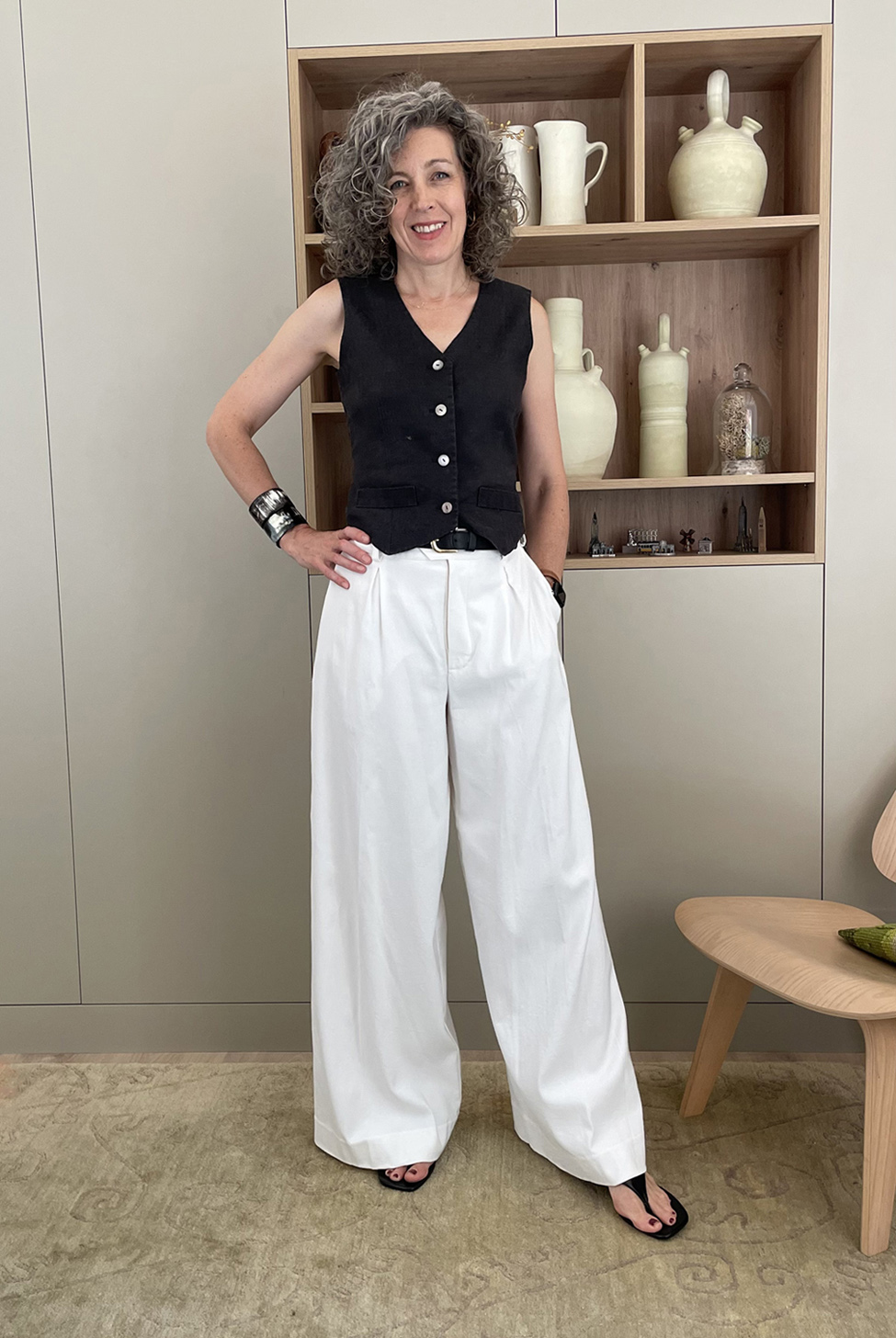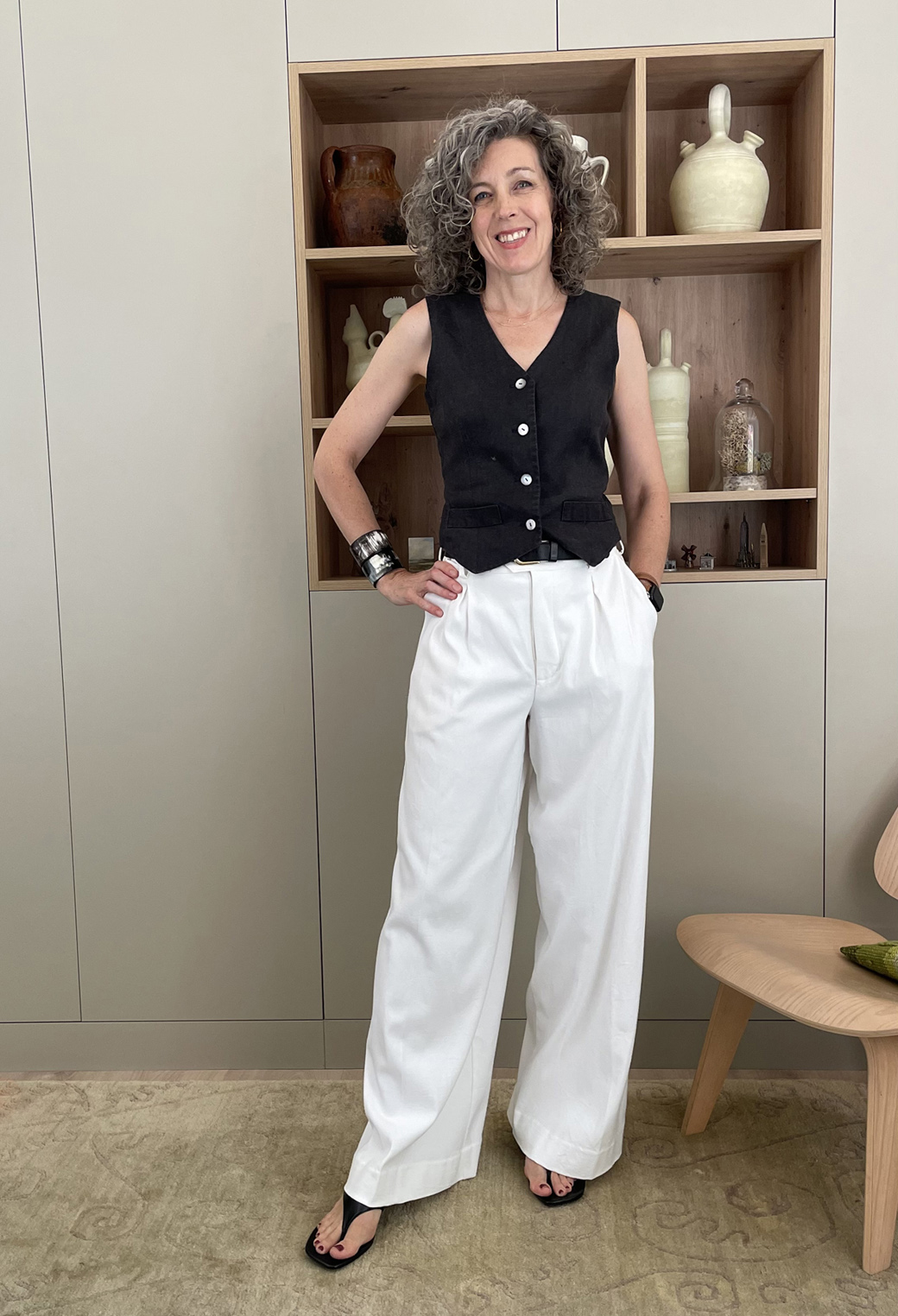 1. First, consider balance and scale. If one piece is oversized, consider wearing something else more fitted with it. For example. I love wide-legged trousers, but I often balance them with a more fitted top. For example, I swapped out the Classic Shirt for this Lisette for Butterick B6901 vest. The closer fit of the top allows the trousers to be the dramatic part of the look, but they don’t overwhelm my body.