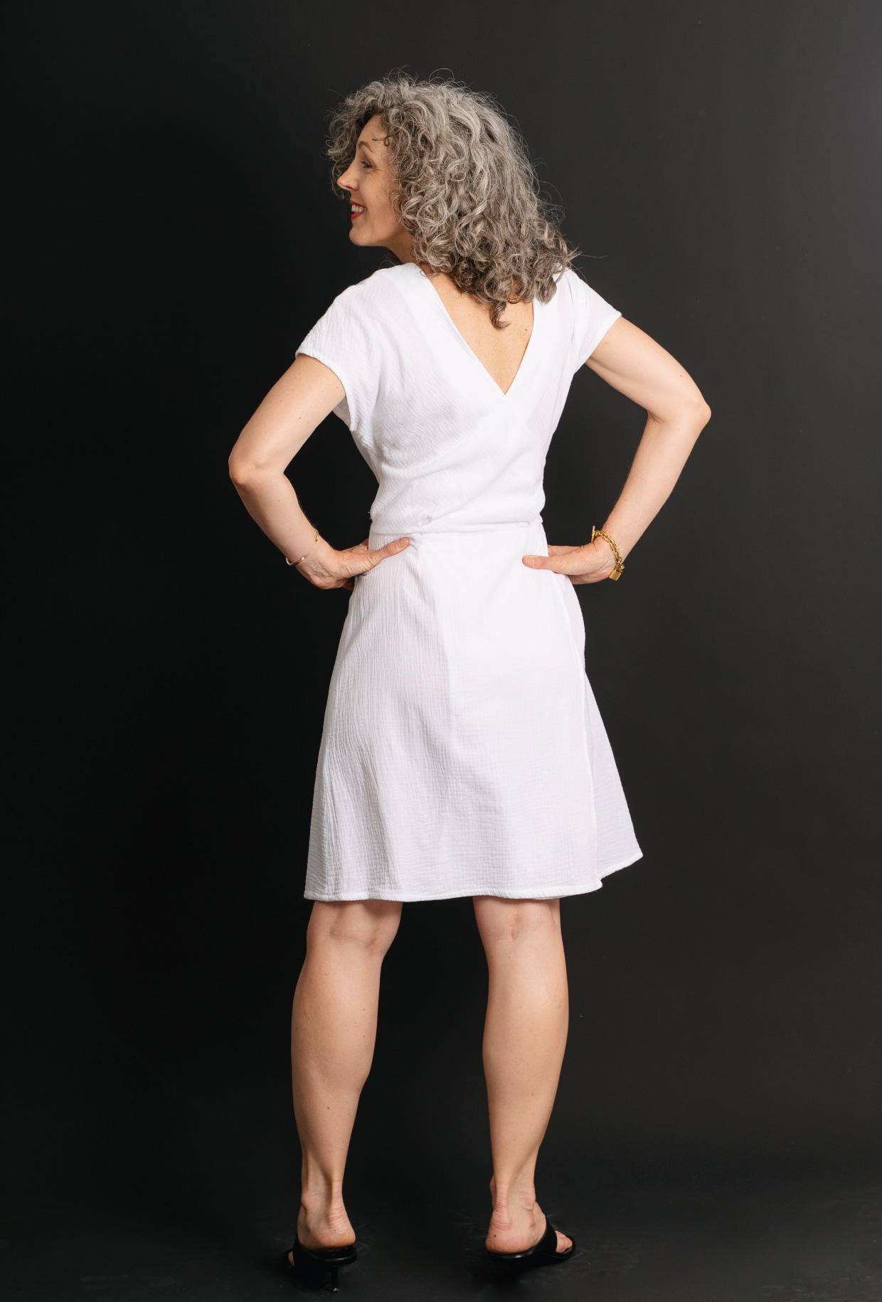 You look fabulous in your white wrap dress! Thanks for the tips for sewing with gauze. I have worked with it a little in my art quilts, and it is tricky to work with. A little starch might help too.