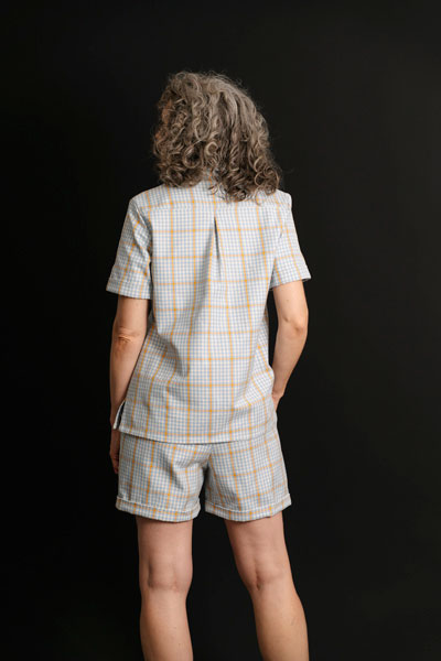 These popover-style pajamas look a lot like the classic button-down version, but the buttons stop halfway down so the top stays closed without the uncomfortable buttons. The top features a convertible camp collar, two front pockets, back yoke with inverted box pleat, side vents, and cup sizes. Choose long sleeves (View A) or short sleeves (View B), both with a foldable cuff. The bottoms have front pockets, an elastic waist, and can be sewn either as trousers (View A) or shorts (View B), both with cuffed hems.